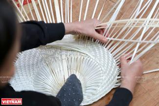 Trong cái nóng oi ả gần chạm 40°C, bác Việt (67 tuổi) cẩn thận gọt từng mép khung nan quạt. Những giọt mồ hôi rơi xuống. Dưới con dao sắt, từng mảnh vụn tre tua tủa bắn ra. Tay bác mang bao tay cẩn thận để tránh trầy xước. “Nhà bác chỉ chuyên vót tre, bác ngồi từ sáng đến chiều. Mỗi ngày gọt 1.000 khung tre nên cũng đau lưng, đau tay lắm,” bác trò chuyện.