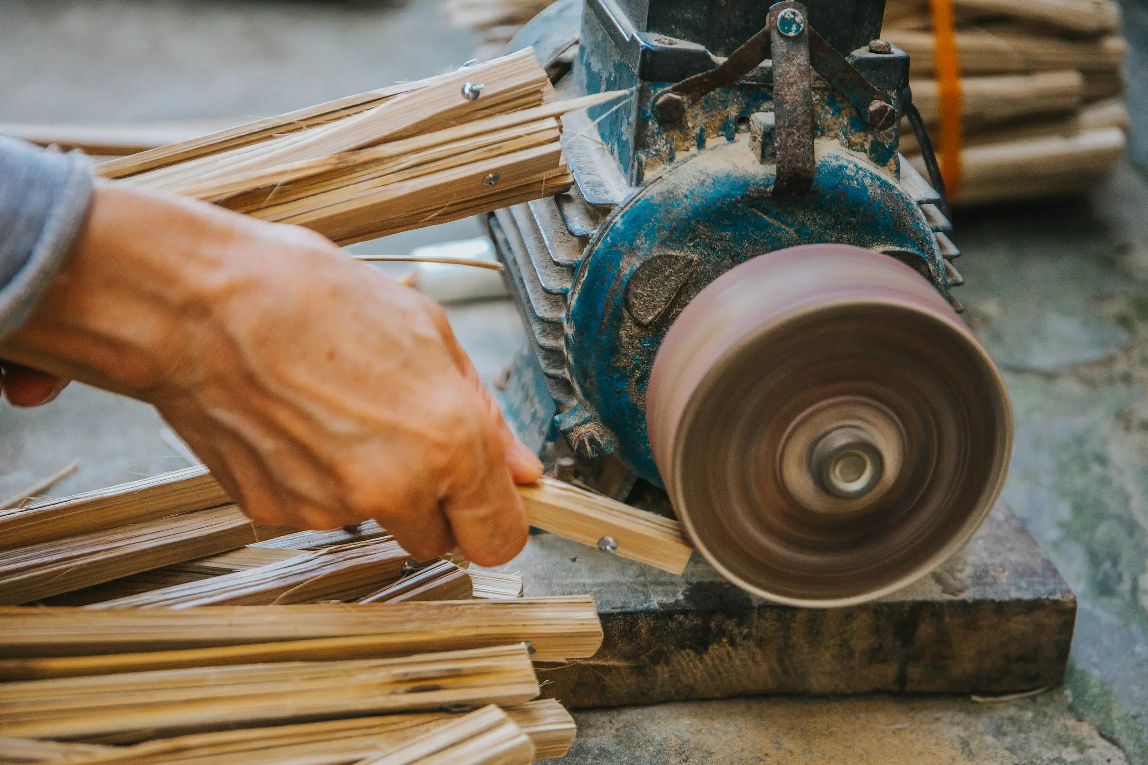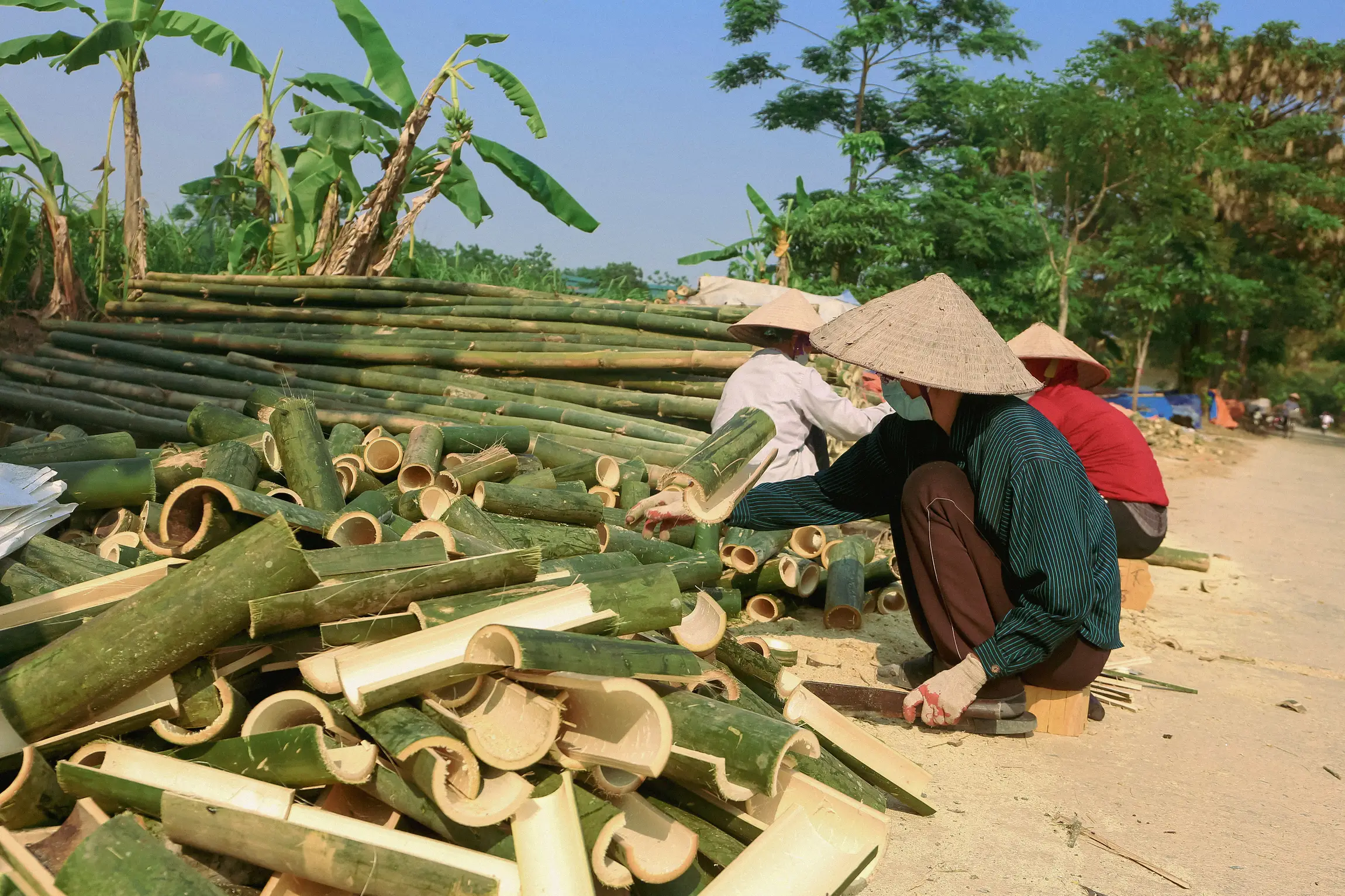 Tre cắt thành ống, cạo tinh xanh, lấy dao tách cật ra, gắn sơn ta vào giữa hai thanh tre. Sau đó, các thanh tre được bó chặt lại vài tháng, đến khi khô sơn mới vót thành nan quạt. Sợi mây phải óng, mượt, dài để khi đan không phải nối nhiều đoạn lại với nhau